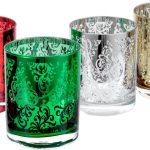 - 4-piece stemless glassware set engraved with a Baroque pattern on multicolored plating, the perfect finishing touch for holiday dining tablescapes
