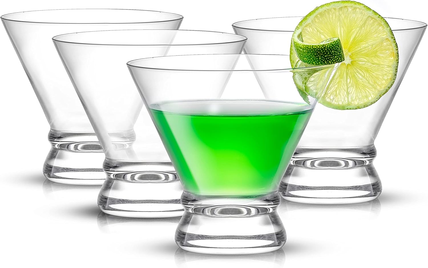 - This cocktail glass set is a modern take on a classic glass. These 8-ounce Martini glasses are casual yet elegant with their cinched design. It has a heavy base elegant stemless construction that ensures stability.