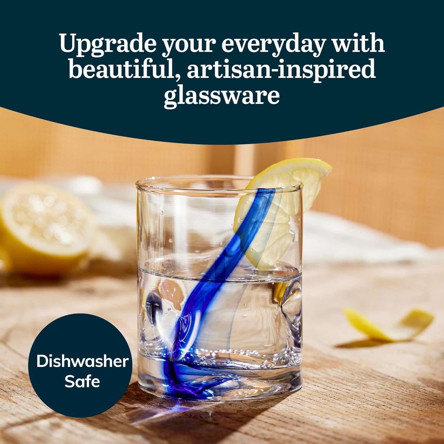 - Glasses Set: Enjoy your beverages with our 8-piece everyday use drinking glasses set – this glass set contains eight, 12.5 Oz glasses that make an impression with their easy-grip indents and splashy blue stripe