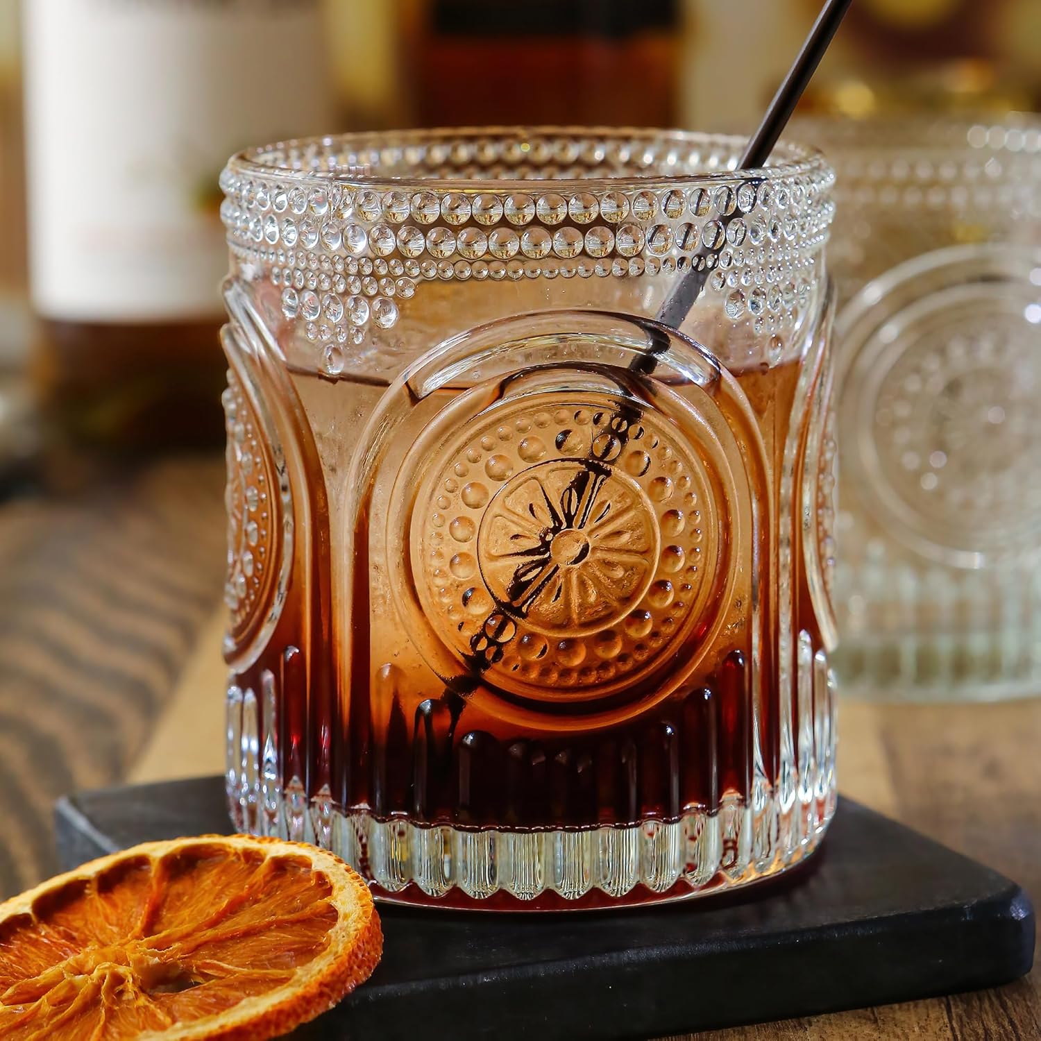 - Vintage-inspired design and embossing that are long lost to bring you a glass that you will be proud to serve your guest with! They will elevate every cocktail or signature mocktail. They look great on a bar cart or with exposed cupboards. Great for floating shelves or behind your favorite bar.